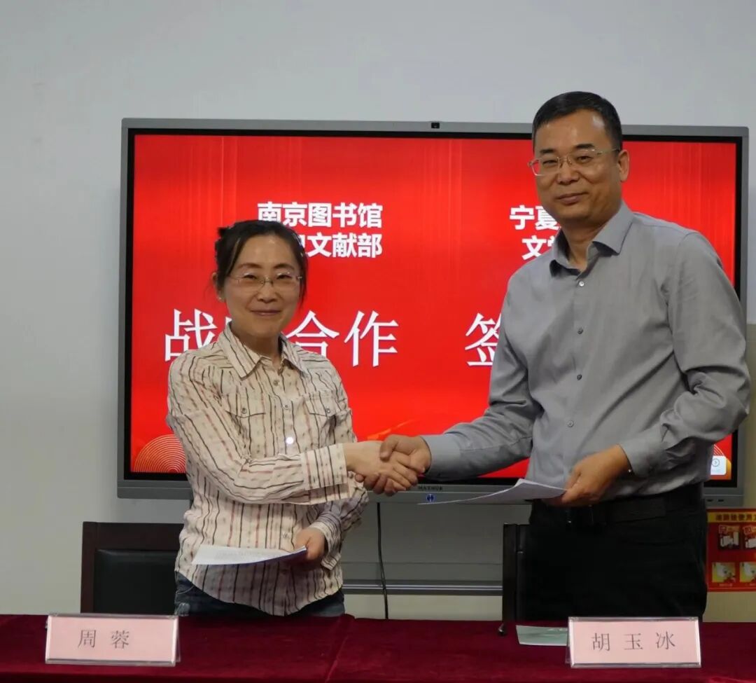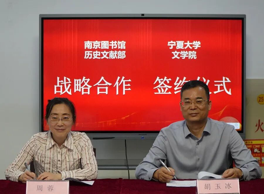 为加强高校与图书馆的协作,促进学术研究与馆藏利用的共同发展,4月24日下午,宁夏大学文学院与南京图书馆历史文献部交流座谈会暨战略合作协议签署仪式在南京图书馆历史文献修复中心成功举行。本着优势互补、长期合作的原则,文学院与南京图书馆历史文献部强强联合,经友好协商,就共同建立战略合作关系达成协议。宁夏大学文学院院长胡玉冰教授与南京图书馆历史文献部副主任周蓉分别代表甲方、乙方签字。