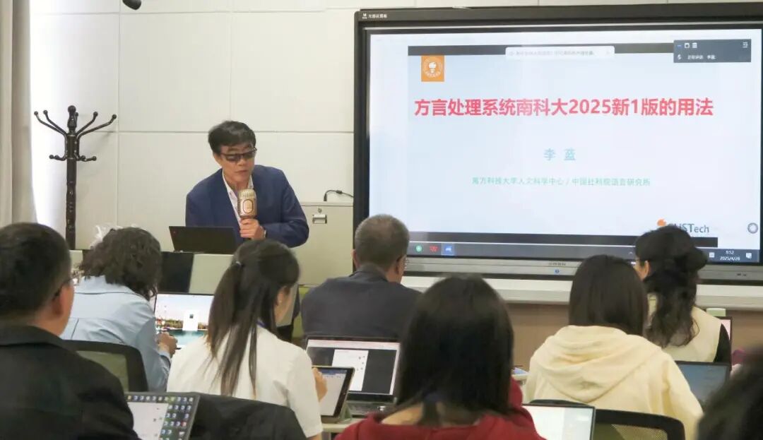 全国汉语方言学会前副会长、南方科技大学讲席教授、宁夏大学文学院特聘教授李蓝老师现场演示由其负责开发的方言处理系统软件最新版本的核心功能,重点讲解“南科新一版”的升级要点、声学参数提取、语谱图分析等技术操作。学员通过现场操作,掌握了从新建调查点、导入导出语料数据、处理异常语料数据到生成语料分析表格以及录音设备的调试等全流程。针对不同地域的声调变异现象,李蓝老师带领学员利用软件生成音频语图,直观比对发音差异,为精准记录提供技术支撑。